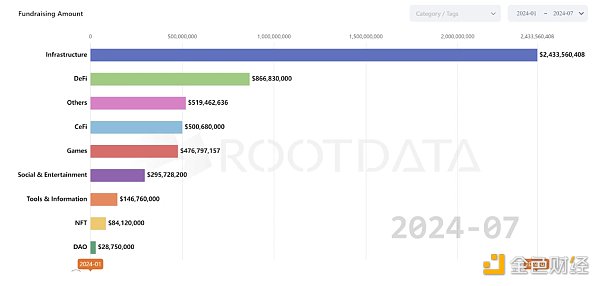賽道表現:以基礎設施最受投資方青睞,共融得24億美元,遠超第二名的DeFi8.6億美元。當中也能看到VC對DAO以及NFT興趣缺缺,排在融資金額最后兩位。