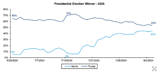 伯恩斯坦分析師指出,Bitcoin仍然是“特朗普交易”,因?yàn)槭袌鲋С置绹偨y(tǒng)候選人對(duì)crypto的開放立場。Polymarket 顯示,特朗普和哈里斯之間的勝算正在縮小,Bitcoin和crypto市場因此走弱。預(yù)計(jì)Bitcoin和crypto市場將在美國大選期間持續(xù)波動(dòng),總統(tǒng)辯論和最終選舉結(jié)果都是催化劑。