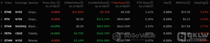 數據顯示,目前在九種Ethereum現貨ETF中,ETHE、ETH和ETHW分別位列管理資產規模的第一、第二和第五位,管理資產總規模達到56億美元。其中,ETHE的管理資產為45億美元,ETH為8.43億美元,ETHW為2.08億美元。