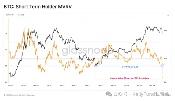 如果我們查看短期持有者的盈利供應百分比,我們可以看到,只有7%的供應處于盈利狀態,這與2023年8月拋售潮中的情況類似。