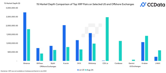 根據CCData的最新報告,目前美國交易所如Coinbase和Kraken的市場深度已達112萬美元,比幣安和Ou-易等離岸交易所高出30%。這意味著,在美國交易所進行價值至少112萬美元的交易,現貨價格才能發生1%的波動。而在離岸交易所,相似金額的交易可能引起更顯著的價格變化。