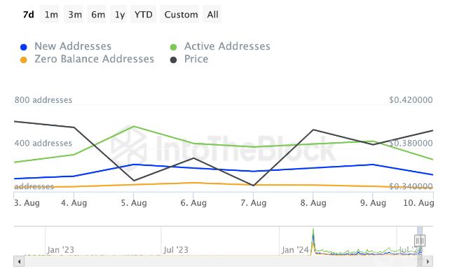Starknet最近宣布,其測試網(wǎng)上成功推出了并行執(zhí)行和區(qū)塊打包的重大升級。這一更新旨在降低Gas費用,并將區(qū)塊確認時間縮短至2秒,預(yù)計將于8月28日在主網(wǎng)上線。根據(jù)IntoTheBlock的數(shù)據(jù),過去30天和365天內(nèi),持有STRK的地址數(shù)量有所增加,這表明持有者對該Tokens的未來持樂觀態(tài)度。