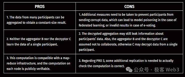 在這種情況下,使用FHE是可行的,所有參與者都有動(dòng)機(jī)誠實(shí)地遵循協(xié)議規(guī)定。而在參與方并非彼此合作的場景中,確保計(jì)算任務(wù)已被正確執(zhí)行的最簡單方法,是引入冗余(類似于多簽/共識)。例如,在前面提到的外包和聚合場景中,同態(tài)計(jì)算用到的函數(shù)公式是完全公開的,并且可以是確定性的,只要兩個(gè)或更多獨(dú)立實(shí)體得出完全相同的輸出密文,那么整個(gè)計(jì)算過程就是正確的,結(jié)果也是可信的。冗余程度越高,最終結(jié)果的可信度就越高,但這需要在效率方面進(jìn)行權(quán)衡。