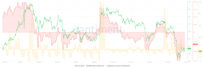 目前,Ethereum的30天市值與實際價值(MVRV)比率顯示,過去30天內購買ETH的投資者平均損失了9%。此外,加權情緒指數降至-0.2%,反映出市場情緒略顯負面。