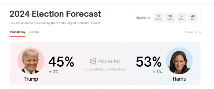 Polymarket 數據顯示,哈里斯的勝率已上升至 53%,領先特朗普 8%。自從拜登退選,哈里斯成為民主黨總統候選人后,她的支持率一路飆升,而特朗普的勝算則從 7月中旬的70% 急劇下降至 45%。