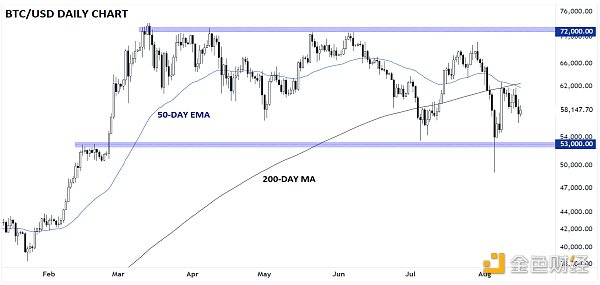 與此同時,Ethereum交易平臺交易基金(尤其是高費用的傳統灰度產品(ETHE))的資金流出開始略有減緩。這些資金流出僅在短短3周內就已經達到基金總額近30%,可能會在接下來的幾周繼續,直到根據其費率結構達到更適當的資產水平。5、Bitcoin技術分析:BTC/USD日線圖