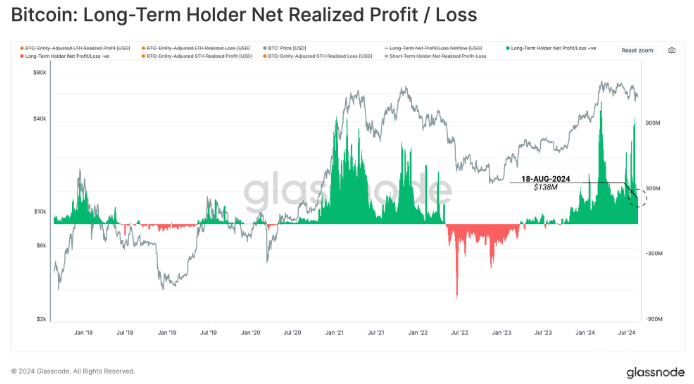 根據(jù)Glassnode的最新報(bào)告,Bitcoin的長期持有者在當(dāng)前橫盤走勢中每天仍保持約1.38億美元的利潤。這表明市場上仍有大量資金流入,以吸收拋售壓力,從而在波動的市場中維持Bitcoin價(jià)格的相對穩(wěn)定。