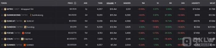 $SUNDOG:開盤價格最低為0.000036 TRX,在20日最高漲至2.32 TRX,漲幅高達6,444,400%。目前價格回落至1.38 TRX,市值為2.12億美元。