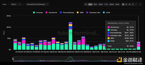 以Uniswap為例,其自三月以來收益大幅增長,而日活躍用戶數(shù)受行情熱度變化影響,在3萬至10萬之間波動(下圖1),但是Uniswap的統(tǒng)治地位受到了Aerodrome的挑戰(zhàn)(下圖2)。