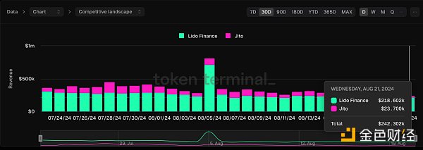 最新數(shù)據(jù)顯示,Lido目前占據(jù)流動性質(zhì)押賽道近70%的份額(下圖1),在收入層面,Lido占據(jù)近80%的賽道收入(下圖2),Lido依靠著先發(fā)優(yōu)勢保持領(lǐng)先地位,但由于與ETH的高度相關(guān)性,與去年同期相比幣價仍回調(diào)31.2%,DeFi整體表現(xiàn)與ETH高度綁定。