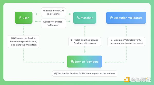 具體執行過程中,用戶會通過前端交互將意圖發送給匹配者,然后匹配者會詢問關聯的服務提供商,詢問他們對這個意圖的報價,返回給用戶;用戶如果認為報價合理,就可以選擇希望執行任務的服務提供商,然后對這個意圖進行簽名,把實現這個意圖所需要的資源都轉給服務提供商,由服務提供商去具體執行用戶的這個意圖。