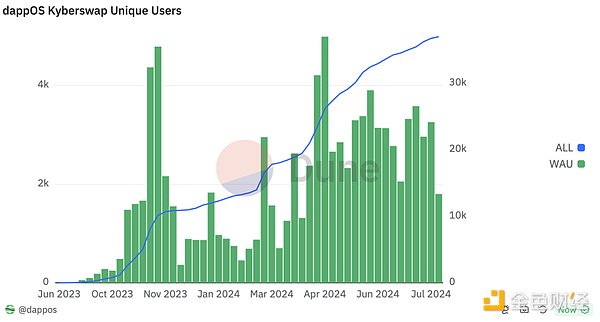 dappOS與Dex和流動性協議也都進行了類似的合作比如老牌dexKyberswap和Avalanche上領先的借貸和流動性協議Benqi等,也都取得了非常不錯的數據(Kyberswap周活躍地址數超過3000,Benqi的周活躍地址數在1000左右)