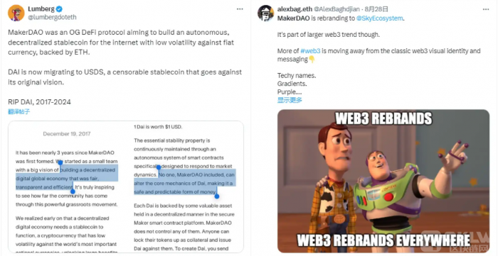 上周,MakerDAO 宣布將其品牌名稱正式更改為 Sky Protocol,并將原有的Tokens和穩定幣升級為 SKY 和 Sky Dollar(USDS)。這一舉動迅速引發了社區的廣泛討論,尤其是在老用戶中間引起了不少質疑和批評。批評者認為,新的名字缺乏特色,更像是一家 Web2 公司,與 Web3 的Decentralization精神背道而馳。此外,關于原X(推特)賬戶的管理不善也進一步加劇了社區的不滿。盡管如此,這一改名行動仍然成為行業內的焦點,尤其是在當今市場環境下,許多項目都在采用類似的策略,試圖通過品牌重塑來重新吸引市場的關注。