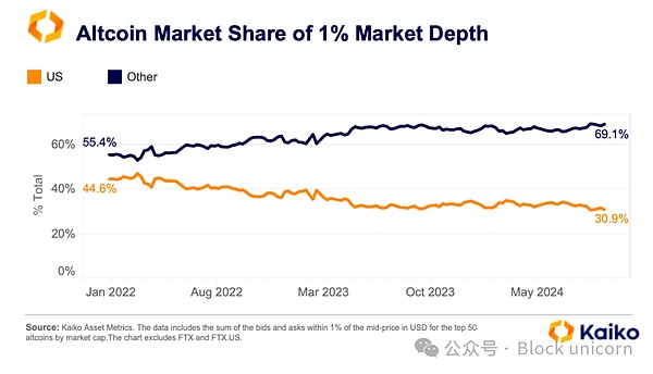 山寨幣的流動性受到FTX和Terra崩潰的重大影響,2022年4月至12月之間流動性下降了超過60%。不過,在過去一年中,流動性逐漸改善,在2024年第一季度超過了FTX崩潰前的平均水平,但在第三季度又有所回落。