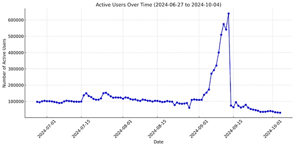 讓我們來看看Catizen,作為Ton生態上熱度最大的小游戲之一,從發幣前64萬活躍用戶降至7萬只需要一天,后續的用戶留存數據更顯低迷。從長線用戶來看,哪怕游戲內容無任何改變,在空投預期不復存在后,高達90%及以上的用戶立即抽身,最終沉淀留存的僅3萬人左右。這樣的用戶留存比是否達到了投資人的預期以及實現了拉新的目的?哪怕獲取了空投的用戶轉向交易所帶來一波即時的用戶增長,在拋售空投變現后,這些用戶是否會像拋棄Catizen一樣。當產品本身變身變成viralcampaign,以拉新為目的的短期項目,哪怕短期為生態帶來了一波增量,但真正沉淀下來的用戶,能否滿足生態和交易所預期,對得起這筆投資呢?我們仍然存疑。