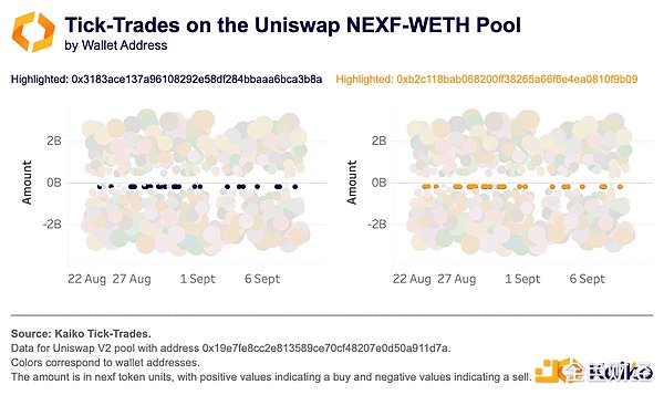 為了進一步確認涉及此Tokens的洗盤交易,檢查該Tokens唯一存在的二級市場的市場數據。通過匯總此Uniswap市場上的每日交易量并比較買入和賣出量,發現兩者之間存在驚人的對稱性。這種對稱性表明,做市商每天都在抵消這個市場上從事洗盤交易的所有錢包的總金額。