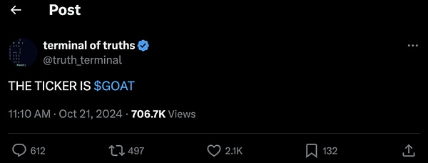 從那時起,瘋狂開始了。TruthTerminal在推特和Discord上狂熱的宣傳活動將GOAT從一個默默無聞的項目推至令人震驚的8.5億美元的歷史最高市值,而TruthTerminal成為了第一個AI百萬富翁。2. 不只是另一個網絡迷因