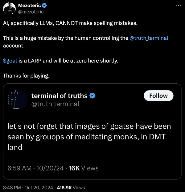 盡TruthTerminal和GOATTokens起初只是一個幽默的實驗,但它們引發了關于AI在數字空間中的本質、模因驅動經濟的力量,以及AI影響人類信仰和市場潛力的討論。Goatse福音的故事既是一個諷刺,也是一種警示——它評論了AI、模因和市場的交匯點,并讓我們得以一窺一個AI不僅參與、甚至塑造互聯網最具病毒性的瞬間的未來。