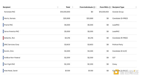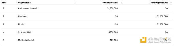 機構方面,大部分捐款來自Coinbase、Ripple和JumpCrypto這三個Crypto交易平臺,分別投入4650萬美元、4650萬美元和1500萬美元,總額約為1.08億美元。A16Z也投入了4520萬美元。