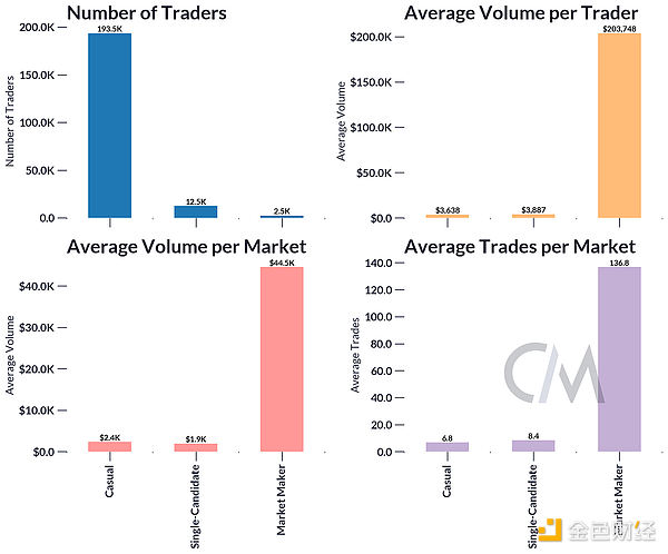 要了解Polymarket用戶在一年中如何影響候選人的勝算,我們可以研究不同股票的平均交易規(guī)模模式。下圖顯示了7天滾動平均投注規(guī)模,揭示了不同選舉結(jié)果的交易行為的顯著模式。在整個期間內(nèi),“特朗普YES”和“特朗普NO”股票的平均交易規(guī)模較高(分別為971美元和955美元),有時出現(xiàn)峰值,表明受外部事件或更大、集中投注的影響而導(dǎo)致的情緒轉(zhuǎn)變。另一方面,“卡馬拉YES”和“卡馬拉NO”頭寸的交易規(guī)模通常較低(分別為274美元和622美元),早期出現(xiàn)分歧。隨著大選臨近,不同股票的交易規(guī)模趨于一致,從而帶來更穩(wěn)定的市場環(huán)境。
