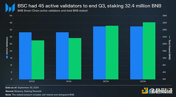 本報告的指標主要集中在BNBSmartChain(BSC)上。BSC是一個EVM兼容的Layer-1Blockchain,由Proof-of-Staked-Authority(PoSA)機制保護,該機制結合了Proof-of-Authority(PoA)和DelegatedProof-of-Stake(DPoS)的特點。在BSC的PoSA中,驗證者集合的大小是固定的,并通過權益權重(質押加上綁定)選舉產生。此外,驗證者必須繼續質押資產以保護網絡,而被選中產生區塊的驗證者是輪換的(不基于權益權重)。有關BNBChain生態系統的完整介紹,請參閱我們的生態系統報告。關鍵指標
