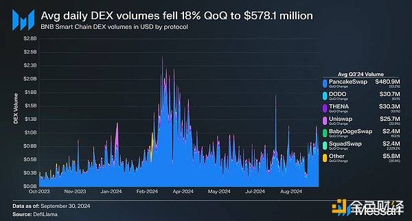 截至第三季度末,BNBSmartChain上有69個不同的DEX(環比增加3個)。盡管競爭激烈,PancakeSwap一直是BNBSmartChain上最主要的DEX。在第三季度,PancakeSwap的平均日交易量為4.809億美元,環比下降23%(從6.258億美元)。PancakeSwap的市場份額從87%下降到83%,環比下降4%。第三季度平均日交易量增長最多的是DODO。其平均日交易量環比增長83%至3070萬美元,成為BNBSmartChain上交易量第二大的DEX。第三季度按平均日交易量排名的前五大DEX如下:
