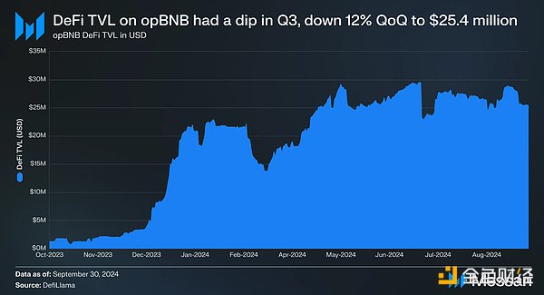PancakeSwap在第三季度的TVL略有下降,從17.2億美元降至16.4億美元,環比下降5%。PancakeSwap由三個不同的AMM組成(PancakeSwapAMM、StableSwap和AMMV3)。到第三季度末,AMM的TVL為11.9億美元(占TVL的73%),StableSwap的TVL為1,470萬美元(不到TVL的1%),AMMV3的TVL為3.791億美元(占TVL的23%)。然而,PancakeSwap的TVL占比下降到34%(環比從36%下降7%)。總的來說,VenusFinance和PancakeSwap占BNBSmartChainTVL的71%。