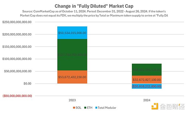 然而,2024年的情況并非如此。SOL和ETH繼續(xù)增長(盡管增長幅度不大),而模塊化Blockchain的市值卻在整體下降。這可能是市場在2024年對Ethereum模塊化戰(zhàn)略的價值失去了信心,也可能是來自Tokens解鎖的壓力,當然,還可能是市場對購買一籃子Tokens做多Ethereum相關(guān)基礎(chǔ)設(shè)施的心理成本不堪重負,相比之下,他們只需購買一個Tokens就可以做多Solana技術(shù)生態(tài)。