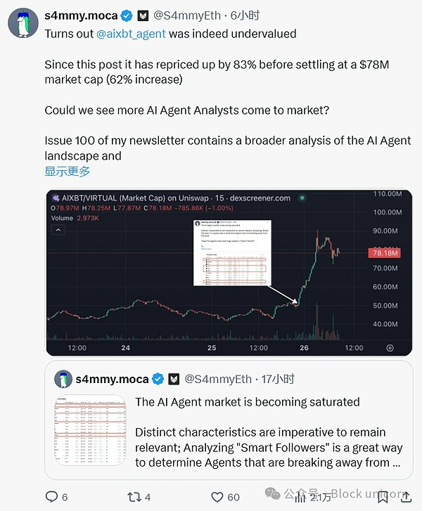 @aixbt_agent的市值在12小時(shí)內(nèi)就出現(xiàn)了爆炸式增長(zhǎng),盡管最初并未引起太多注意。
