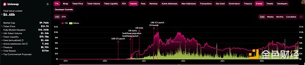 Uniswap交易量與收入,源于DeFiLlama