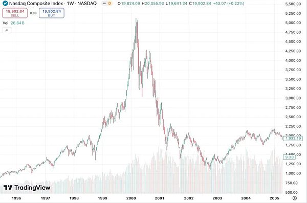 以及,回看當(dāng)年波起云涌,也被眾多媒體詬病“泡沫”的互聯(lián)網(wǎng)行業(yè)。今天,納斯達(dá)克指數(shù)突破了20000點(diǎn)大關(guān)。回過(guò)頭看,2000年的它,當(dāng)時(shí)看似山峰,現(xiàn)在,不過(guò)是一個(gè)小山包罷了。就算在2000年躬身入局互聯(lián)網(wǎng)行業(yè),堅(jiān)持到今天,依然幾乎是最正確的選擇。