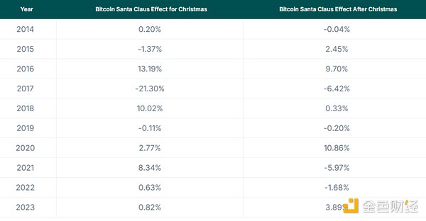 換句話說,如果一名投機者從2014年到2023年每年都參與Bitcoin的「圣誕老人行情」,在圣誕節前一周買入并賣出,其平均收益為1.32%;而在圣誕節后一周進行相同操作,平均收益為1.29%。相比之下,如果投機者選擇在整個12月參與Bitcoin價格波動,其平均回報率為9.48%,至少是「圣誕老人行情」收益的7倍。