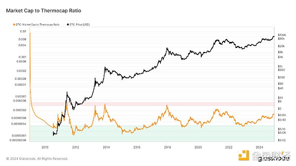 從BTC鏈上指標來看,BTC未實現凈利潤/虧損指標目前處于0.62左右的良性水平(處于信仰階段),與牛市中期的水平相一致,當前處于波峰階段,低于上一個周期的峰值0.75。而MVRV指標也說明了同樣的情況,12月峰值為2.67(處于‘漸高’區間),目前處于持續階段。從市場總市值/礦工累計收入來看,黃色線在2024年的位置遠未進入紅色高位區間,說明市場尚未達到牛市的過熱狀態。目前比率處于中等的水平,從黑色線可以看到Bitcoin價格呈現逐步回升趨勢,與過去牛市中期的表現一致,根據市值水平與Bitcoin價格歷史表現,可以判斷Crypto市場距離牛市的頂峰仍有較大空間,投資者在此階段應關注市場的進一步發展。