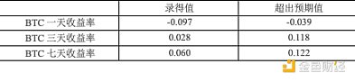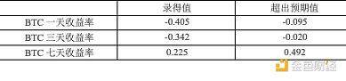 除了美聯儲每年8次的利率調整外,美國定期發布的宏觀數據也能反映當前貨幣政策下的經濟狀況,市場通常根據這些數據預測貨幣政策改革或經濟周期變化,從而影響幣價。重要的宏觀數據包括美國季調后非農就業人口變動、初請失業金人數、實際國內生產總值(GDP)年化季率以及核心居民消費價格指數(CPI)月率。下表列出了2024年Bitcoin幣價在這些指標發布當天、三天內和七天內的短期收益率與各宏觀指標的錄得值和超出預期值之間的相關性。