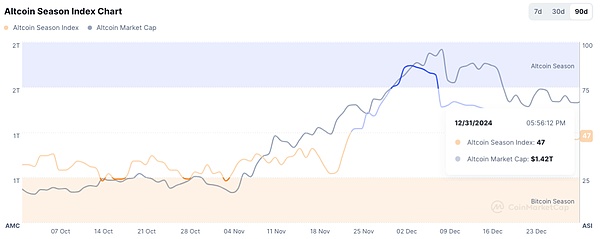 當(dāng)前AltcoinSeasonIndex為47,前值為46;