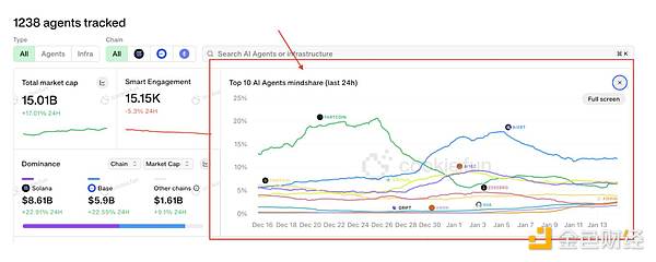 實時鏈上分析工具,利用其泡泡掃描儀可以快速識別哪些項目正在吸引注意力或正在失去關注,目前能夠跨多個鏈跟蹤50多個AIAgentTokens。