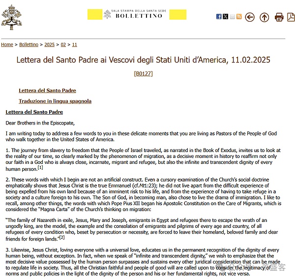 “隨著大規模驅逐計劃的啟動,美國正在發生的重大危機。正確形成的良知不可能不作出批判性判斷,不能不對任何默示或明示將某些移民的*非*法身份與犯罪相提并論的措施表示異議。”