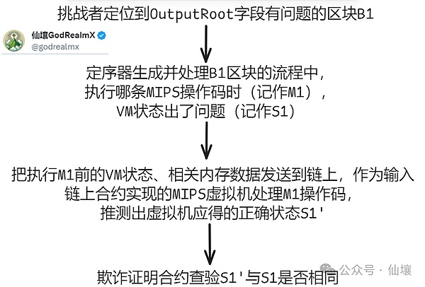 前面我們提到,假設我發現OP定序器提交的OutputRoot有問題,就可以發起“挑戰”,挑戰流程需要在鏈上完成一系列交互動作,交互完成后,相關智能合約會斷定OP定序器是否上傳了錯誤的OutputRoot。