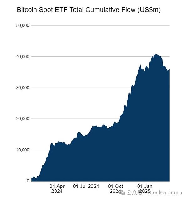 截至2025年初,幾乎所有ETF流動(dòng)性都流向了Bitcoin,總額達(dá)400億美元,如圖表所示。難怪Ethereum多年來對Bitcoin一直在下跌。大多數(shù)山寨幣也是如此。