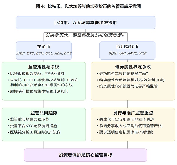 除穩定幣外,市場上還存在著Bitcoin(BTC)、Ethereum(ETH)等不與任何其他資產掛鉤的Crypto。按照是否擁有獨立Blockchain基礎設施,這些Crypto可分為主鏈幣和應用型Tokens兩大類。主鏈幣是Blockchain網絡的原生貨幣,擁有自己獨立的Blockchain基礎設施和共識機制;而應用型Tokens則構建在現有的Blockchain平臺之上,具有特定功能或代表特定權益。這類Crypto的監管趨勢主要集中在以下方面: