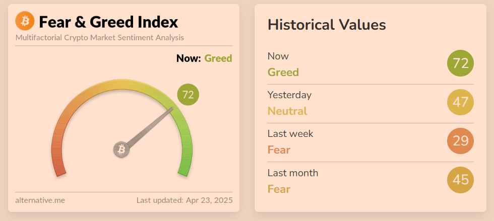 在DCA的基礎上,如果你希望稍微提高投資的效率,可以引入市場情緒指標作為輔助判斷。其中,“Crypto恐懼與貪婪指數(shù)”(CryptoFear&GreedIndex)是一個廣受關注的指標。