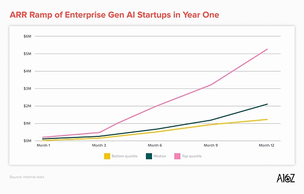 更讓我印象深刻的是,a16z投資人觀察到頂級表現者和普通表現者之間的差距正在擴大。許多突破性公司在第一年持續加速,而不是像我們在前AI時代經常看到的那樣開始放緩增長。這表明,對于優秀產品,無論是企業用戶還是消費者都有巨大需求,所以值得大膽嘗試。