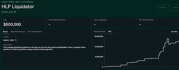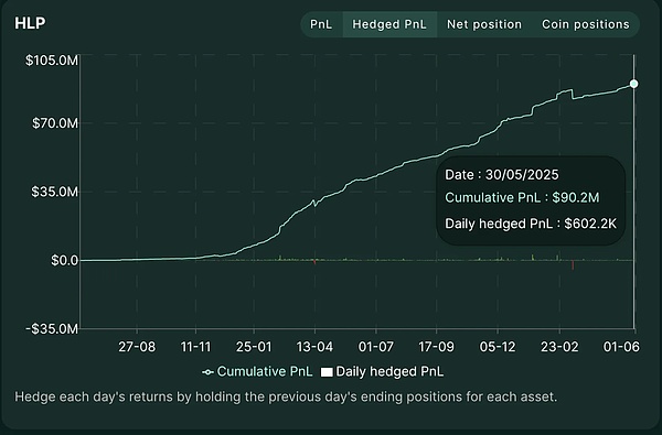 協議的核心流動性是HLPVault,一個結合做市商與清算人的混合金庫,占據TVL的90%以上