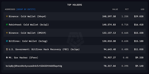 通過Arkham,我們可以看到哪些具體錢包持有最多的Bitcoin: