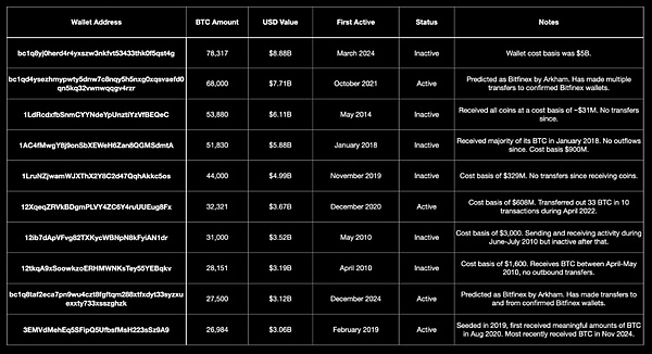 以下是最大的未歸屬Bitcoin持有者表格,顯示其持有的Bitcoin數量、占流通供應量的百分比、錢包狀態以及對錢包的觀察。