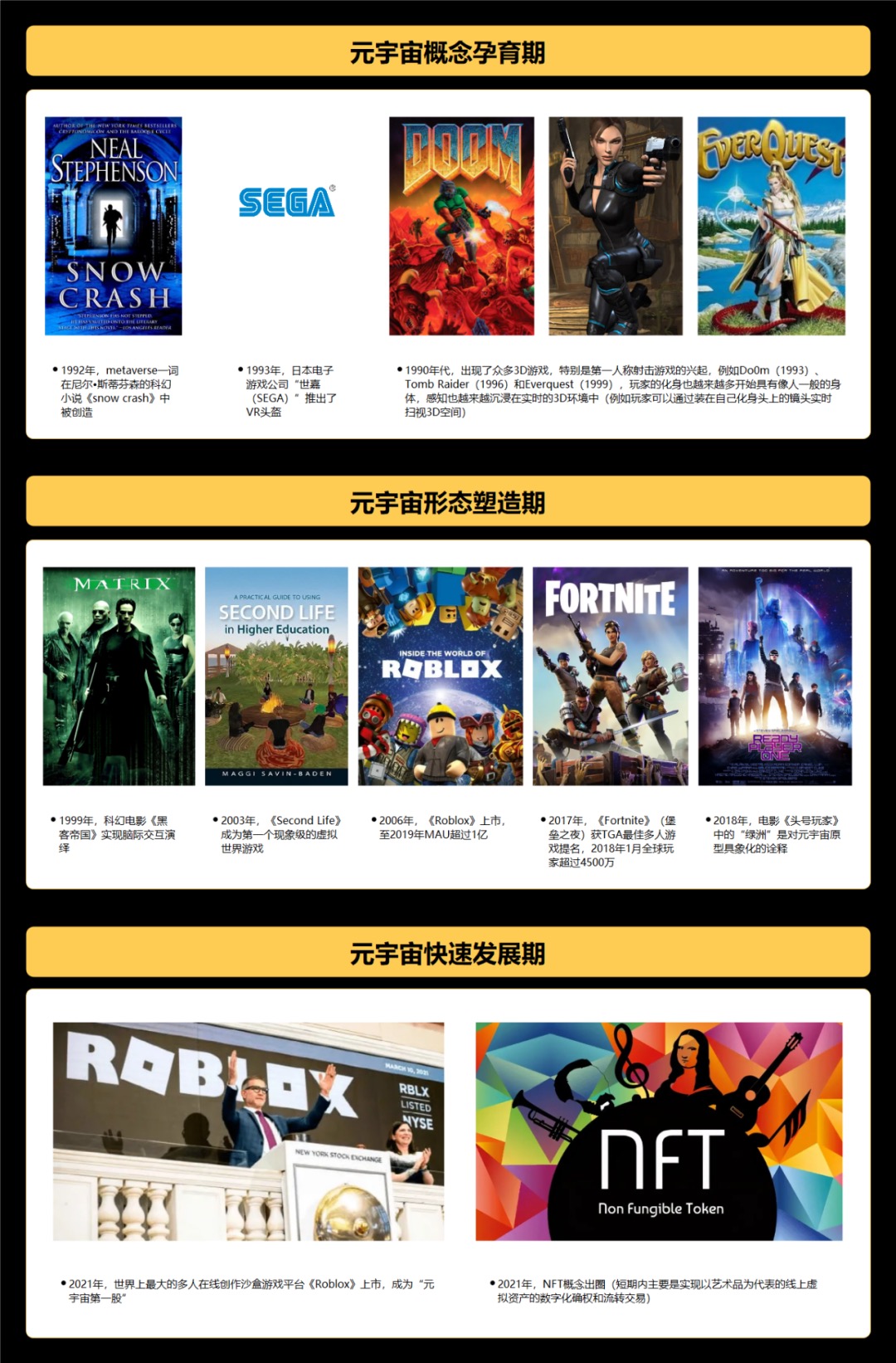 90年代還出現(xiàn)了眾多3D游戲,玩家的化身也越來(lái)越多開始具有像人一般的身體,感知也越來(lái)越沉浸在實(shí)時(shí)的3D環(huán)境中。赫胥黎想象中的設(shè)備(商業(yè)VR)也是在這個(gè)時(shí)候出現(xiàn)。此時(shí)元宇宙的概念雖未被提出,但什么是元宇宙似乎已逐漸明了,就是讓人們能夠在虛擬世界中享受沉浸式體驗(yàn)。而后《黑客帝國(guó)》和《頭號(hào)玩家》,則把這種真實(shí)世界與虛擬世界的交互通過大熒屏演示了出來(lái),后者構(gòu)建出的“綠洲”,其實(shí)非常接近當(dāng)下提出的元宇宙概念了。而真正將元宇宙概念推向高潮,是2021年。有兩件標(biāo)志性事件,Roblox上市,成為“元宇宙第一股”,以及NFT(Non Fungible Token,即非同質(zhì)化Tokens)出圈。