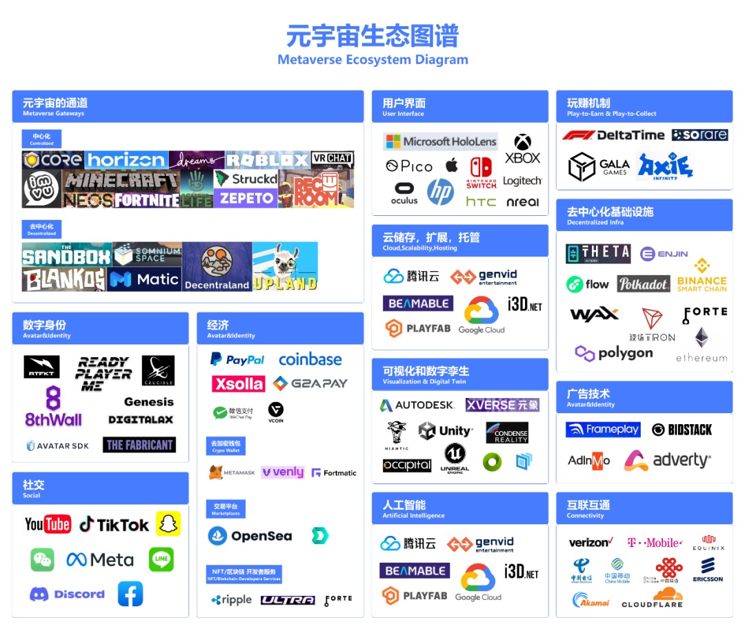 前面提到的企業(yè)更多是主動(dòng)布局元宇宙,但還有更多企業(yè),早在元宇宙概念出現(xiàn)前就已經(jīng)在做基礎(chǔ)建設(shè)了,比如云儲(chǔ)存、人工智能、操作系統(tǒng)、支付系統(tǒng)、Decentralization交易所、5G網(wǎng)絡(luò)等等。