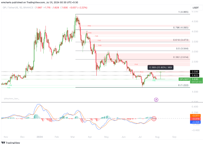 動量指標收斂/發散移動平均線(MACD)表明,OP可能會先向支撐位修正并在升至目標價位之前收集流動性。如果出現更大的回調,OP可能會在7月5日的低點1222美元處找到支撐。