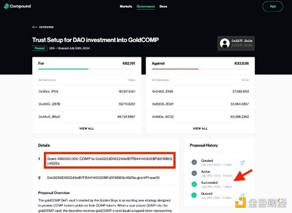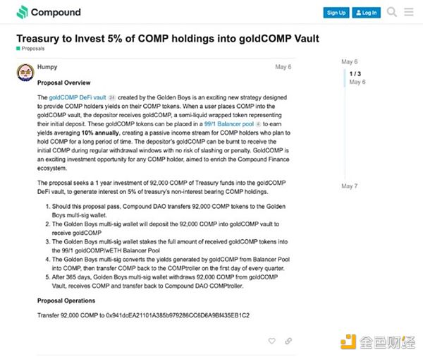 Goldenboy帶頭人Humpy提議:向他們的goldCOMP金庫投資9.2萬COMP,為期1年,并將這些Tokens轉移到Golden Boys多簽錢包。