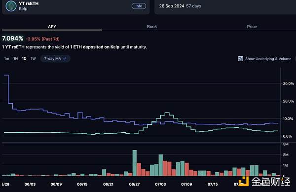 Pendle YT 市場對 LRT WrapETH 資產的定價區間已經降至 6%~7%。目前,Renzo 的 rsETH 的 YT 最高,但也僅有 7.1%。這個幣本位收益率水平,已經很難吸引 ETH 持有者和空投農民冒著本金損失的風險質押和再質押 ETH。